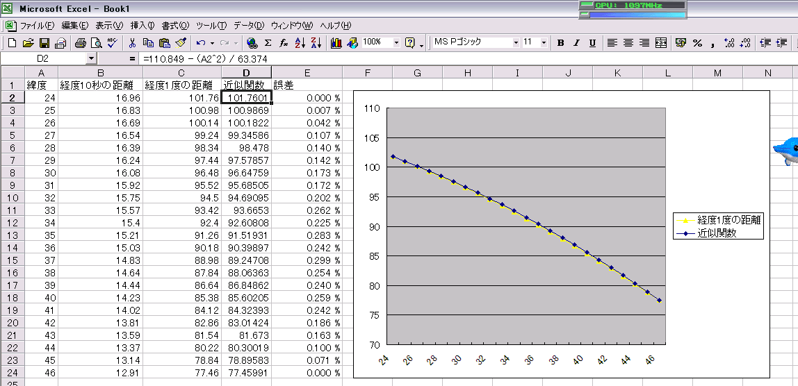 というわけでゼンリン電子地図帳で距離を測って、それに近い数値がでるように適当に式を作ってみたのが今回の掲載画像のExcelです。