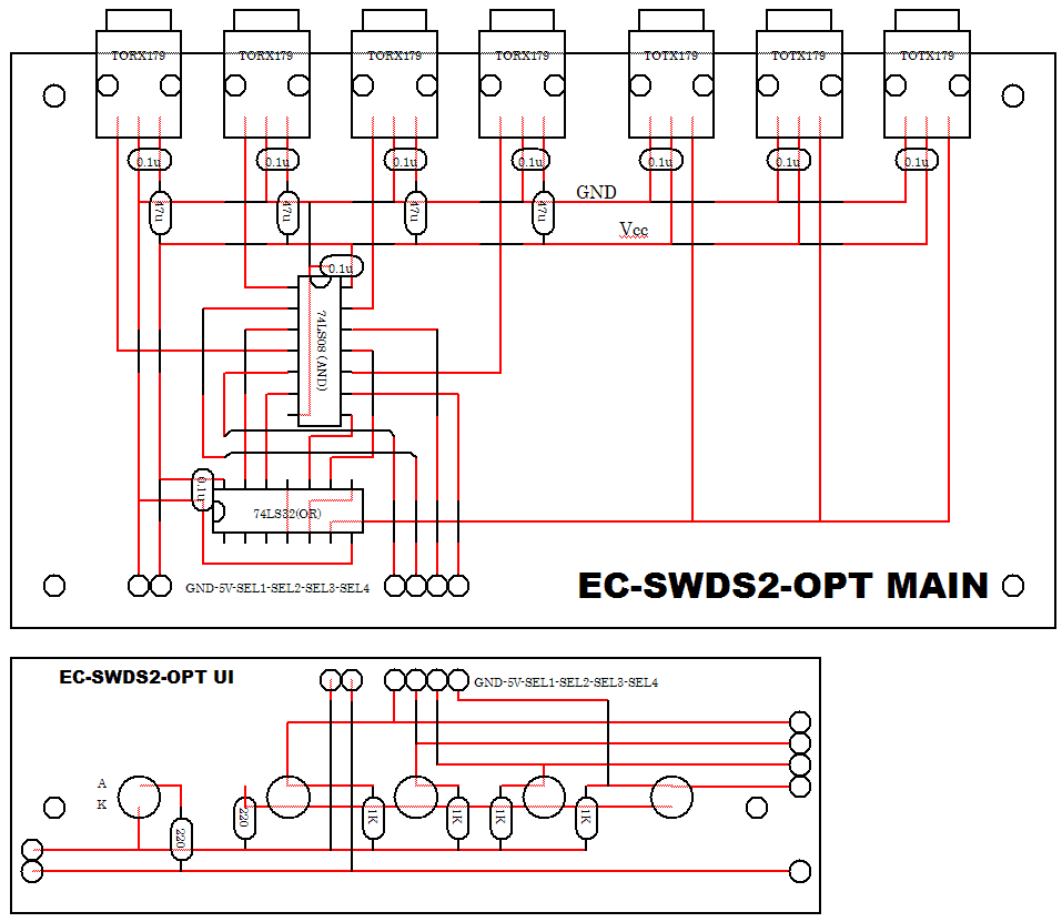 というわけで…光入出力端子の幅を変えたりLED駆動回路がいらなくなってたりするので実体配線図を書き直し。