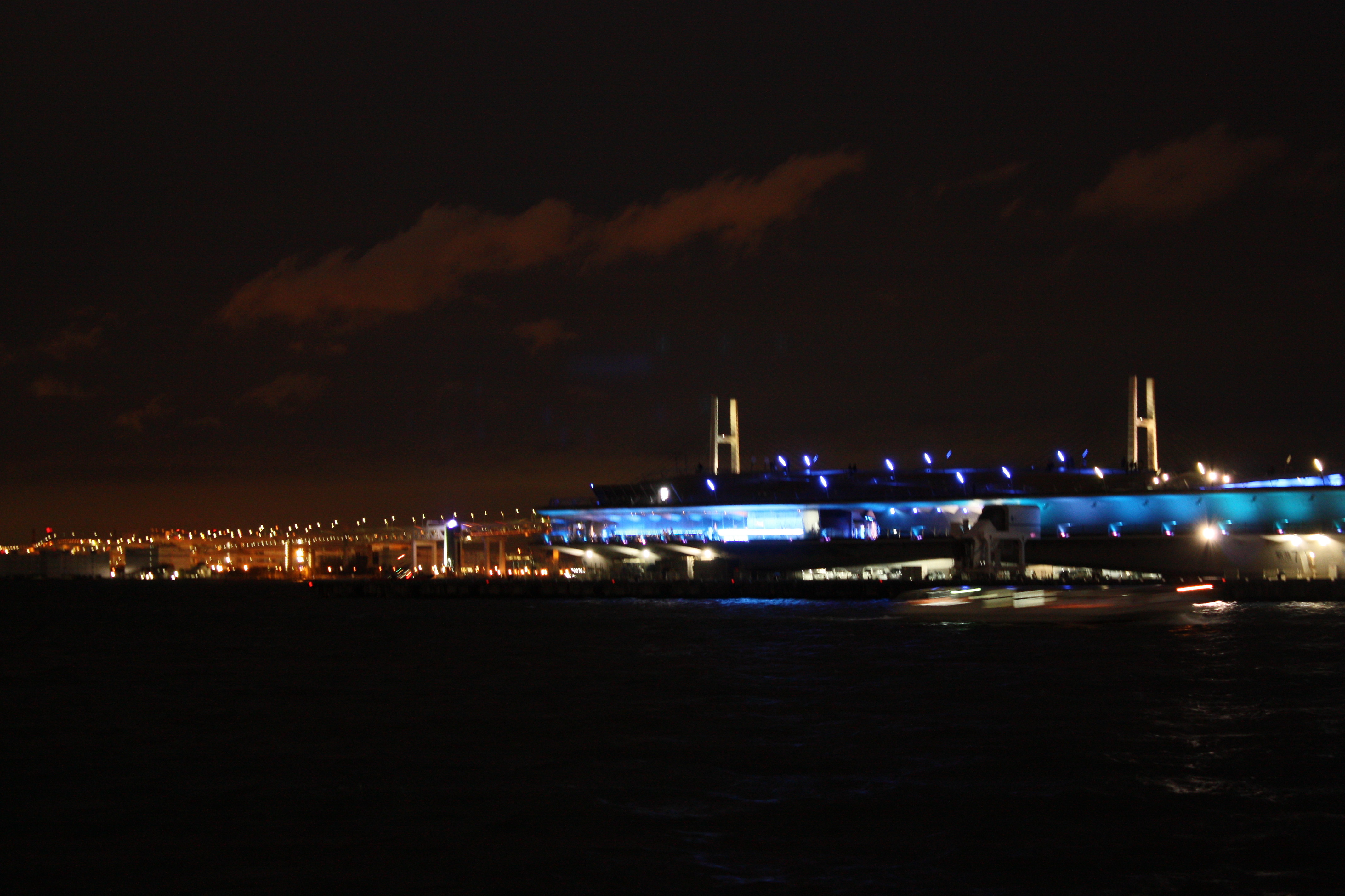 で、この写真、なんかレインボーブリッジの上に青い光が見えるんですよ…。
