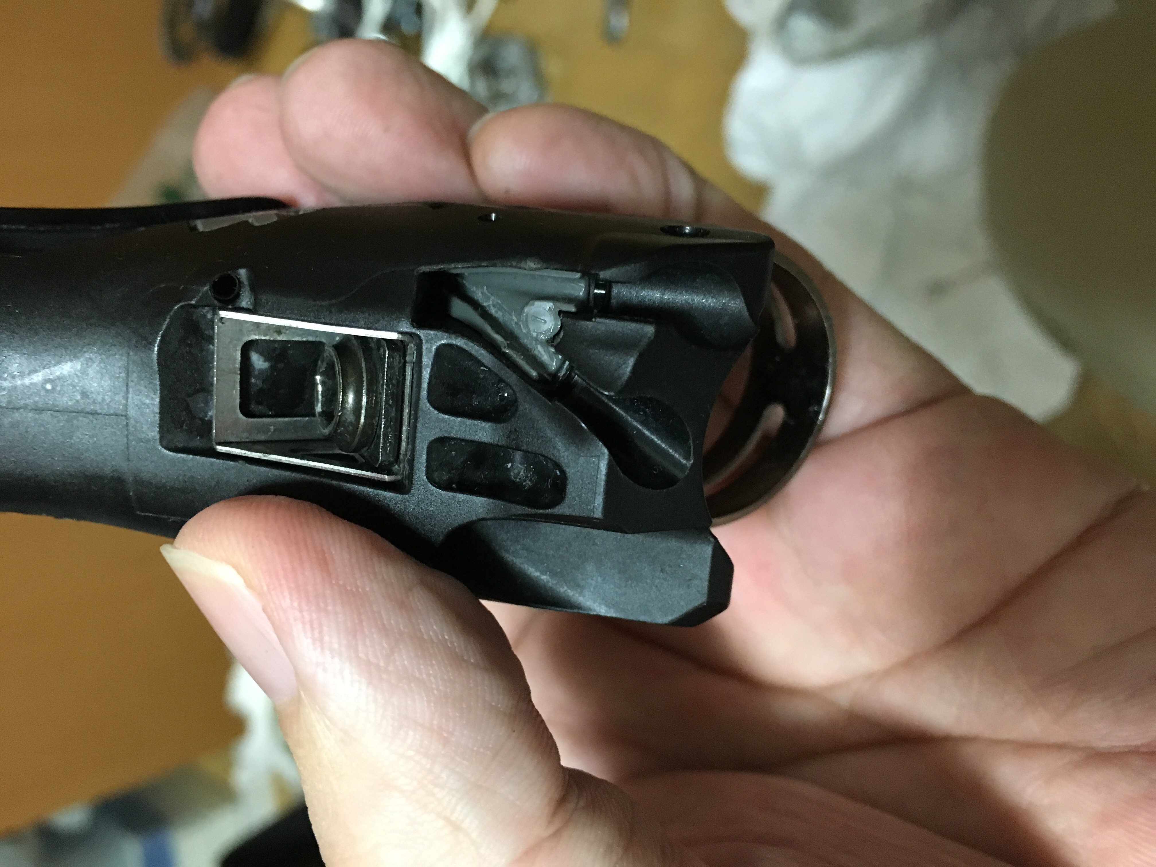 これは普段通りなら変速ワイヤーのタイコ付近がブチブチに切れてSTIの中がバリバリになってるやつだな…と思いながら会社に着いてブラケットカバーをベロンチョと捲ったら案の定バリバリ。