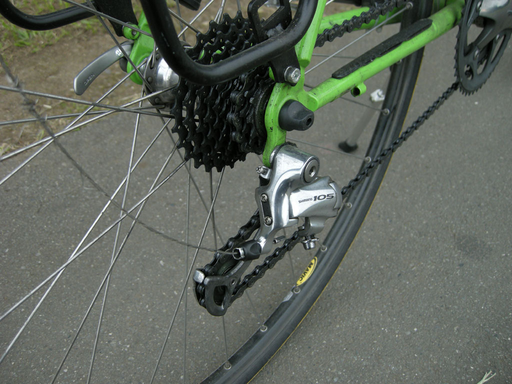 トップノーマルなのでほっとくとトップギアに入ってしまいますが、それでは大変なのでトップ側のアジャストボルトを締めてみたところワイヤーなしの状態で8速に入るようにできました。
