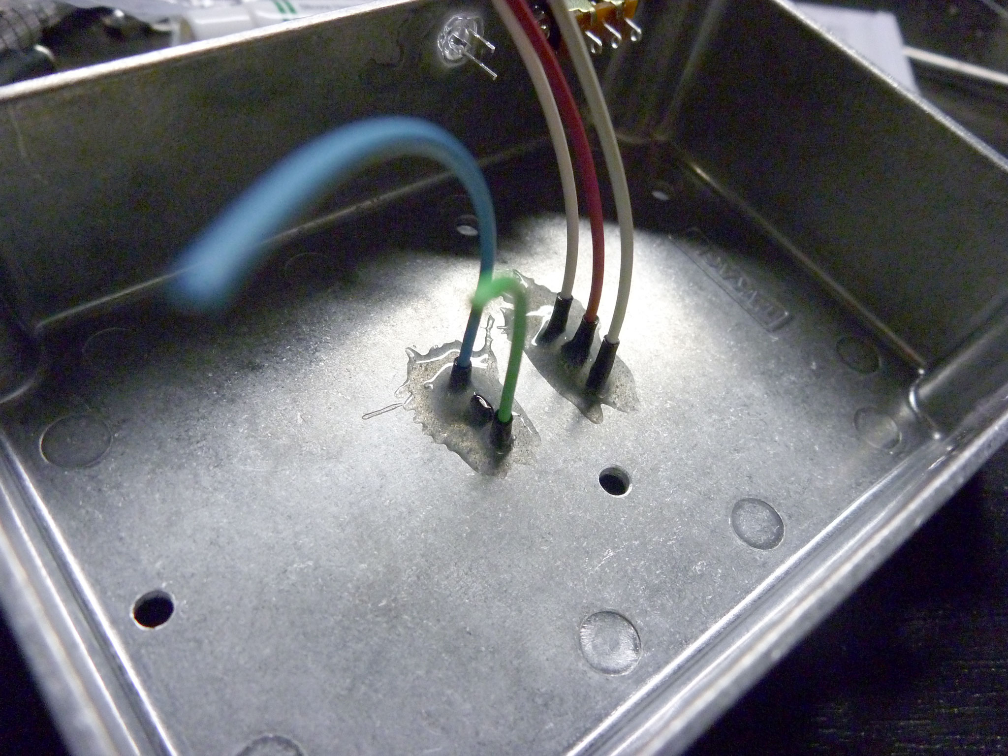 LEDの足が横に伸びているとやりにくいので、真下に曲げて、ケースに足6本分の穴をあけて、LEDの足にビニル線を半田付けして、熱収縮チューブで絶縁処理。放熱をよくするためにシリコングリス塗って、差し込んで接着。