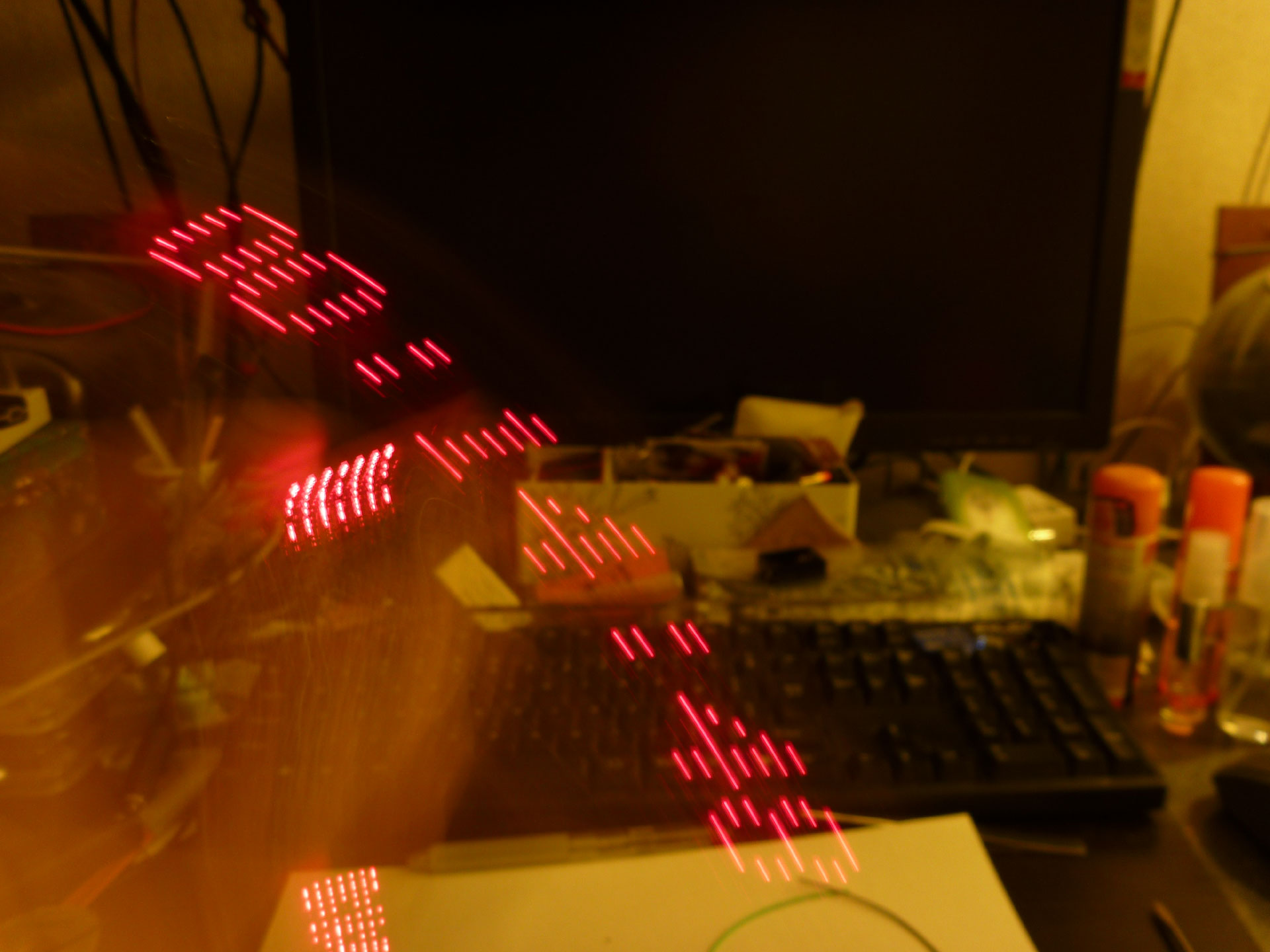 前述の傾斜スイッチが入ってしばらくしてからLEDに文字フォントデータを連続してドラララっと送りこめばいいだけなので、別にむずかしいことはないです。