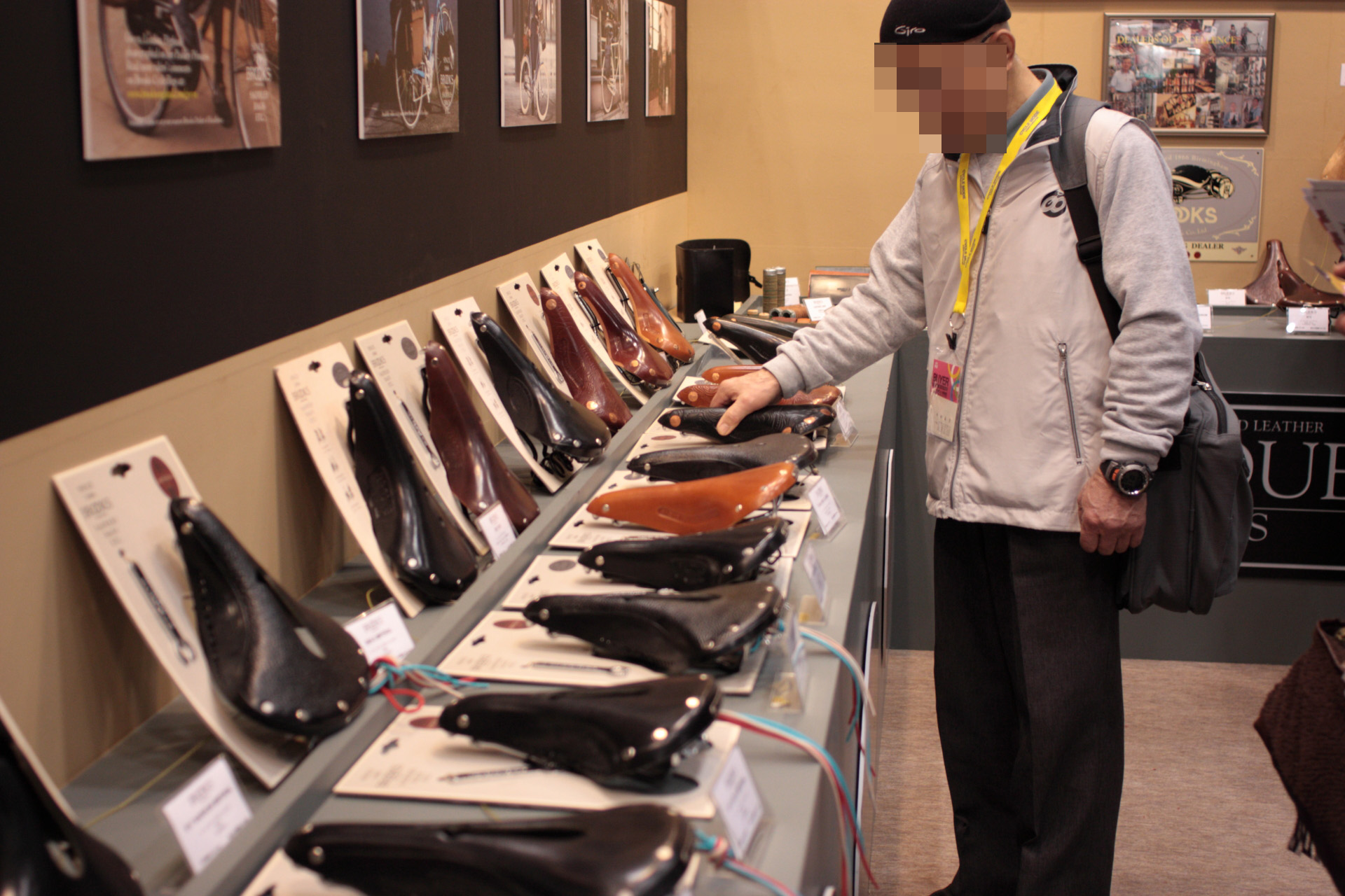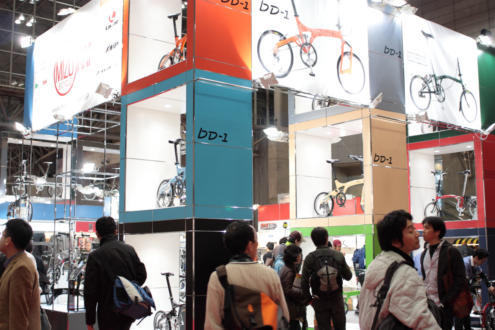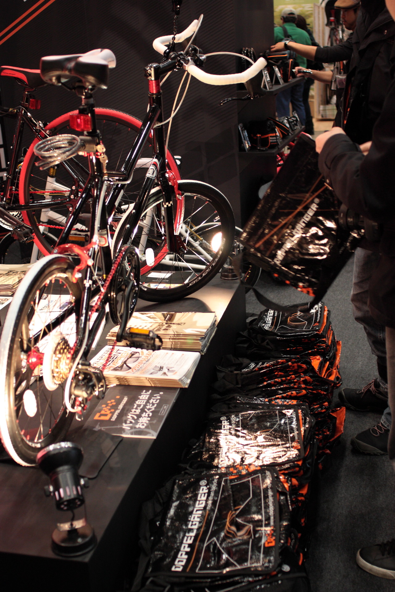 オレンジの折りたたみ自転車でおなじみドッペルギャンガーのブースですが、「バッグはご自由にお持ちください」の紙と山盛りのバッグが。