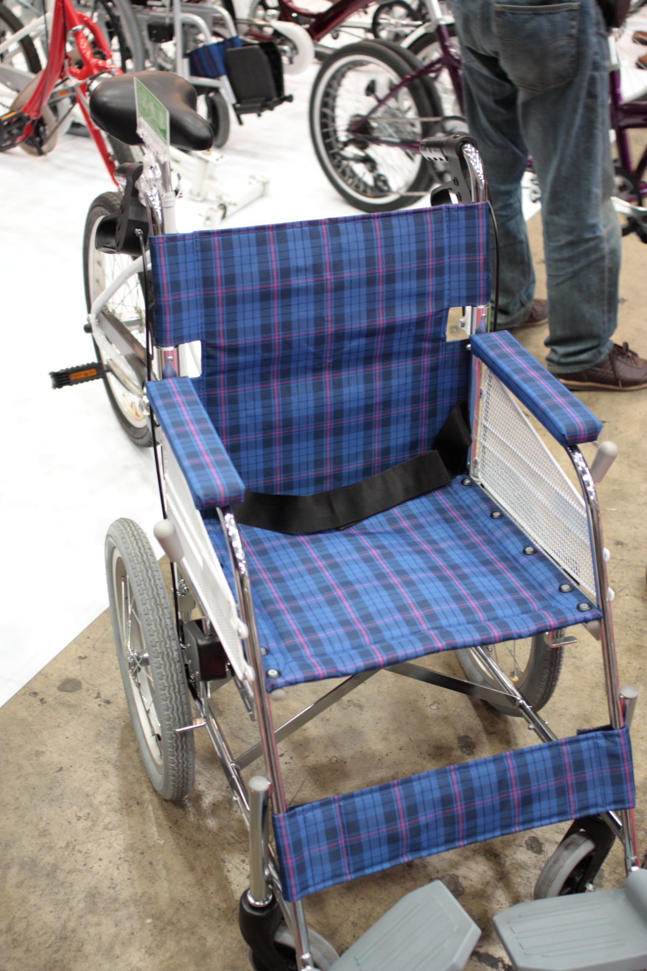 車椅子の後ろのハンドルがそのまま自転車こぐ人のハンドルになってます。笑える。