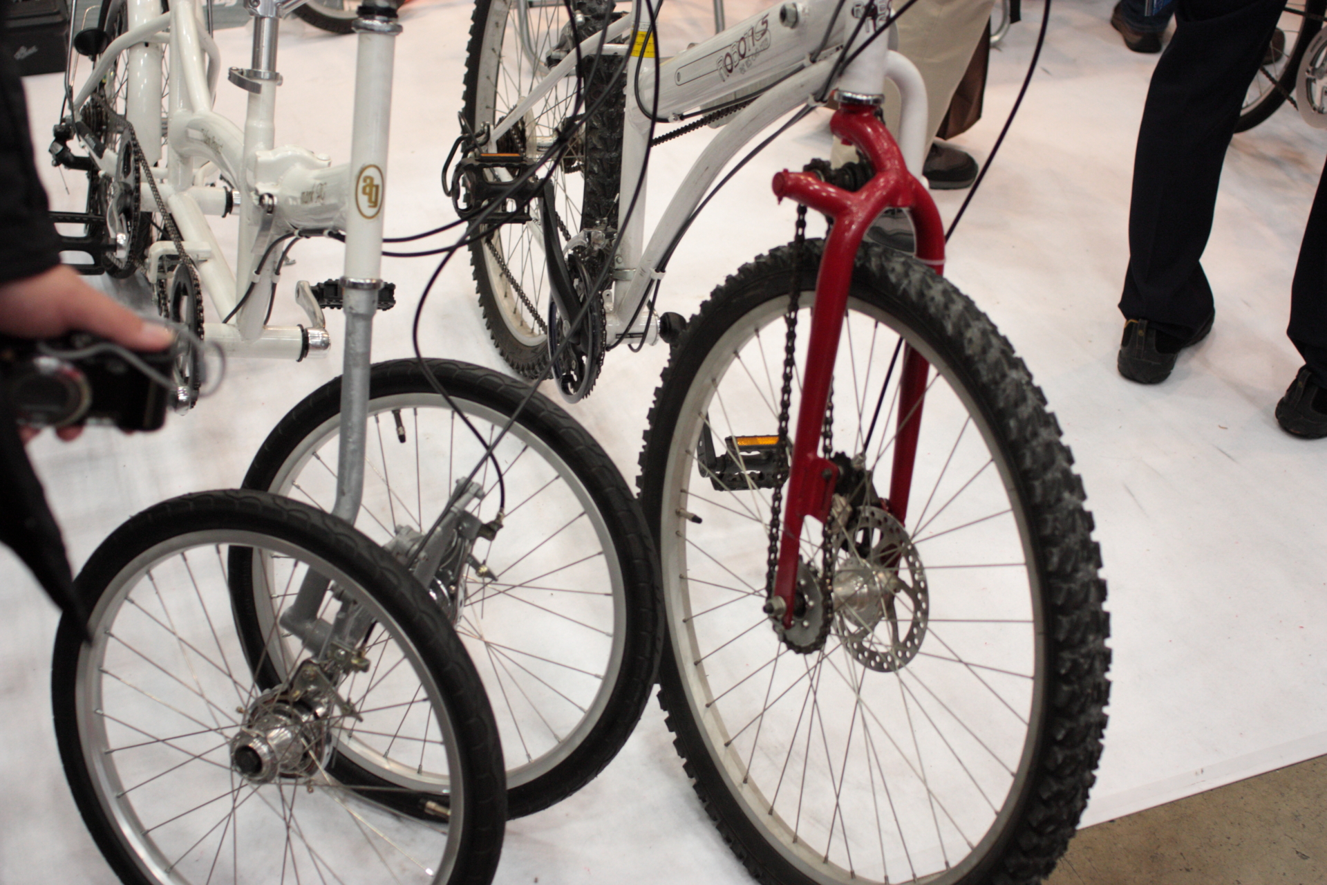 右は前輪駆動つき自転車。チェーンリング→後輪のスプロケ は普通ですが、スプロケの反対側→トップチューブの中→ヘッドチューブとチェーンが通っていて、その先に向きが変えられるジョイントが付いてて、その先に前輪のスプロケがついてます。よく考えたもんだ。