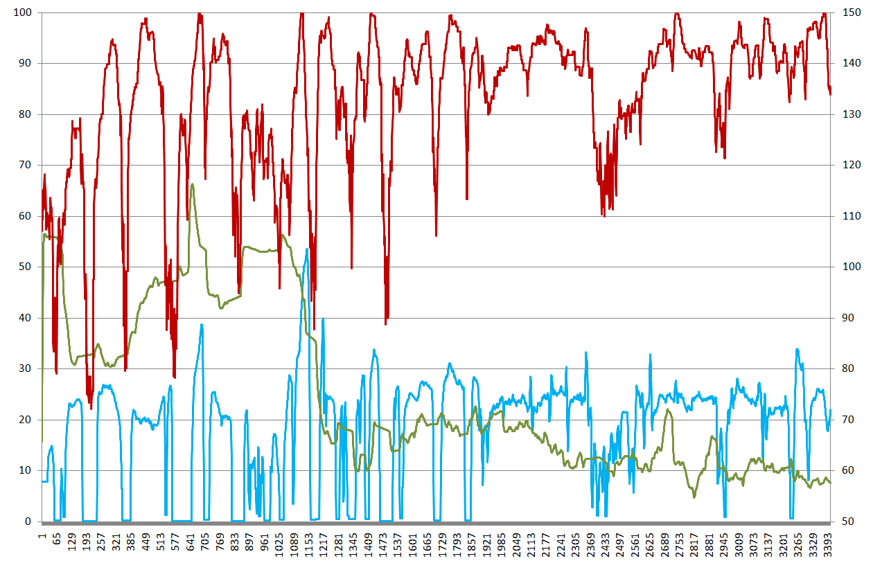 緑色が高度。こうやって見ると市が尾から会社までの起伏がかなり激しいのが分かる…。あと激坂下りでは心拍が落ち込んでスピードが上がっている。当たり前かw