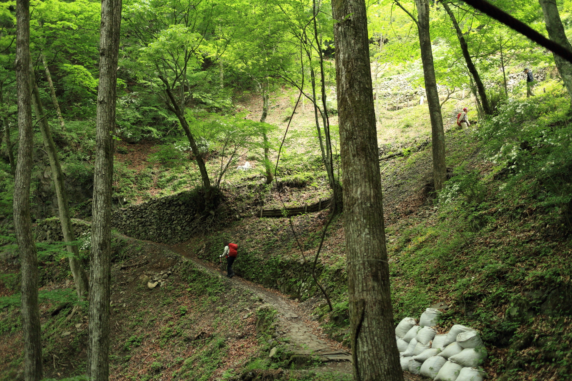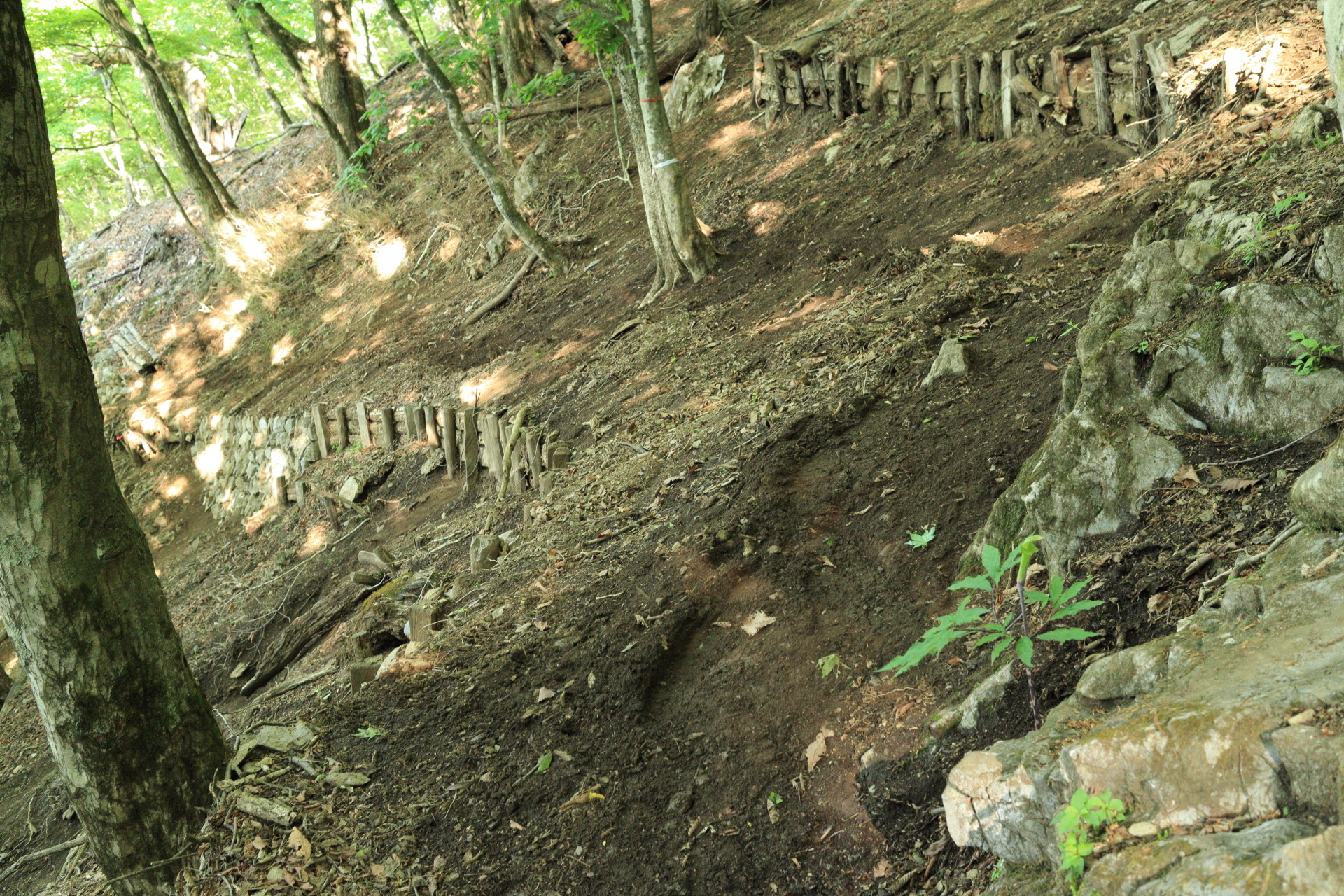 上から崩れてきた土が道に乗っかってしまって道が斜面になってる。