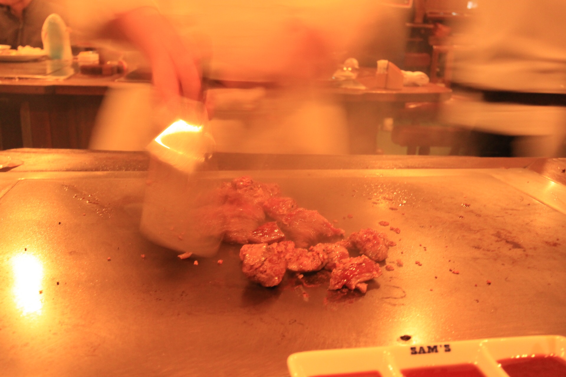 目の前の鉄板でパフォーマンスしながら焼いてくれるんですが、