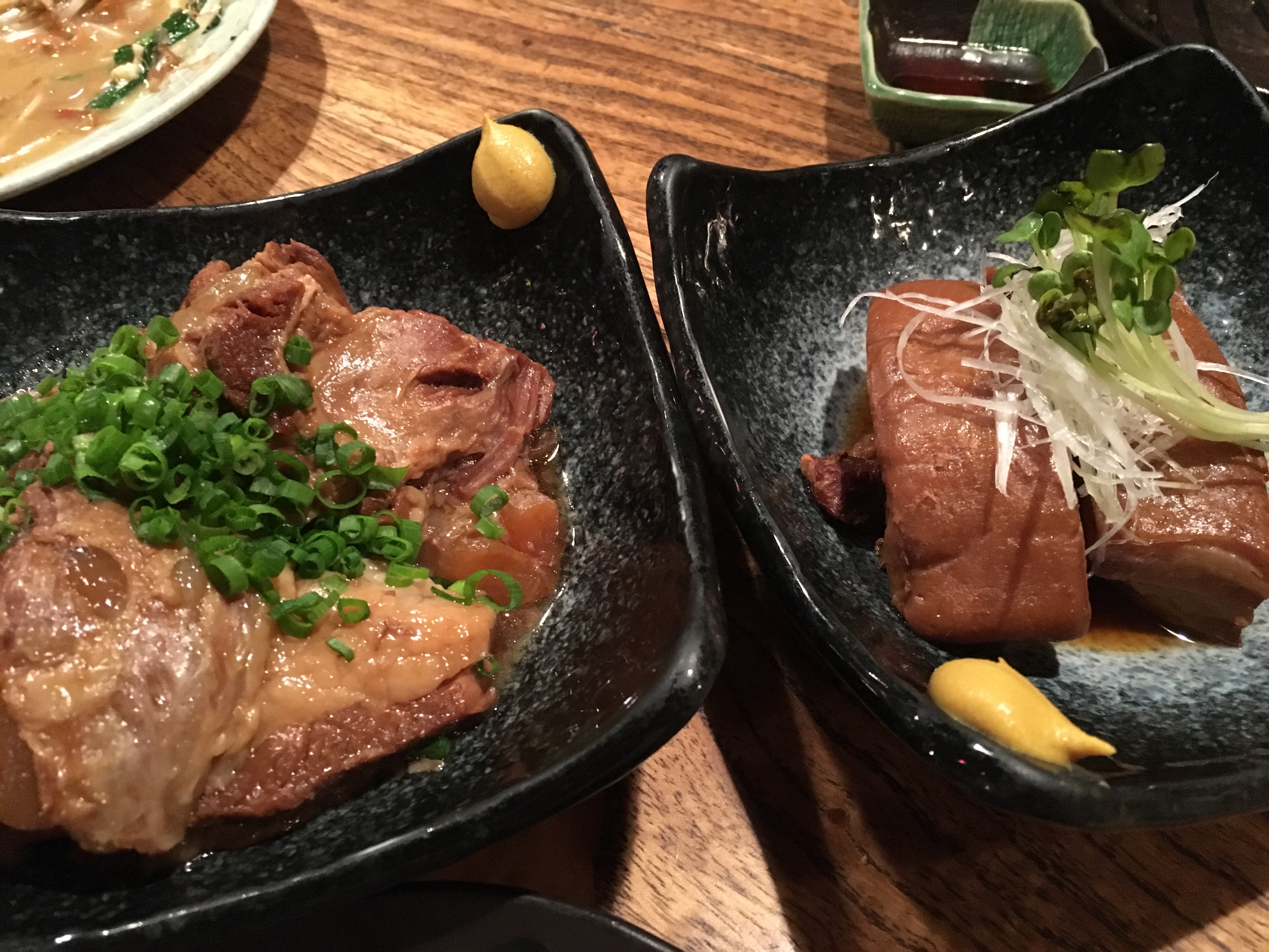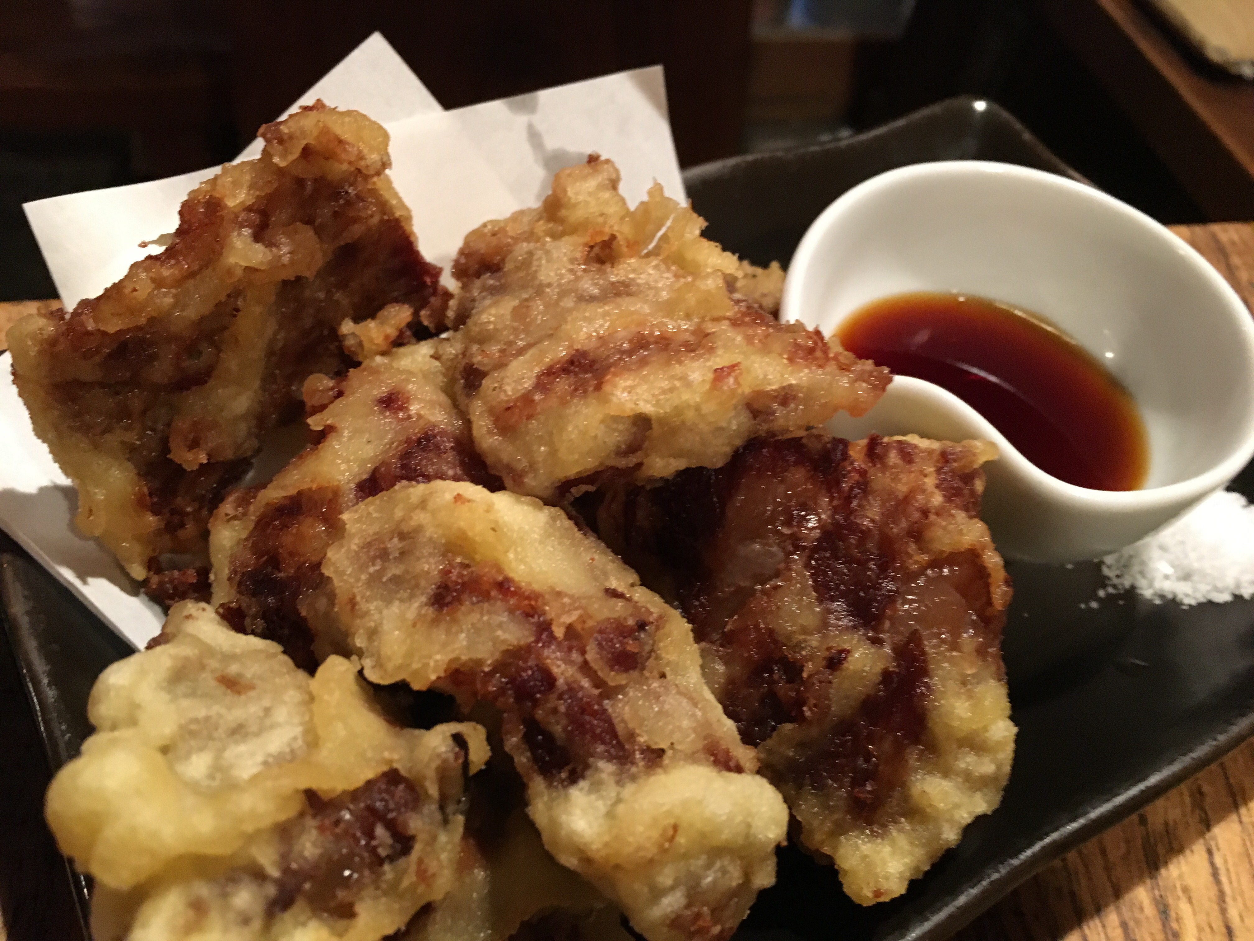 豚の軟骨付き肉を、軟骨がプルプルになるくらいまで味付けして煮てあるもの、の唐揚げ。確実にうまい。コラーゲン。